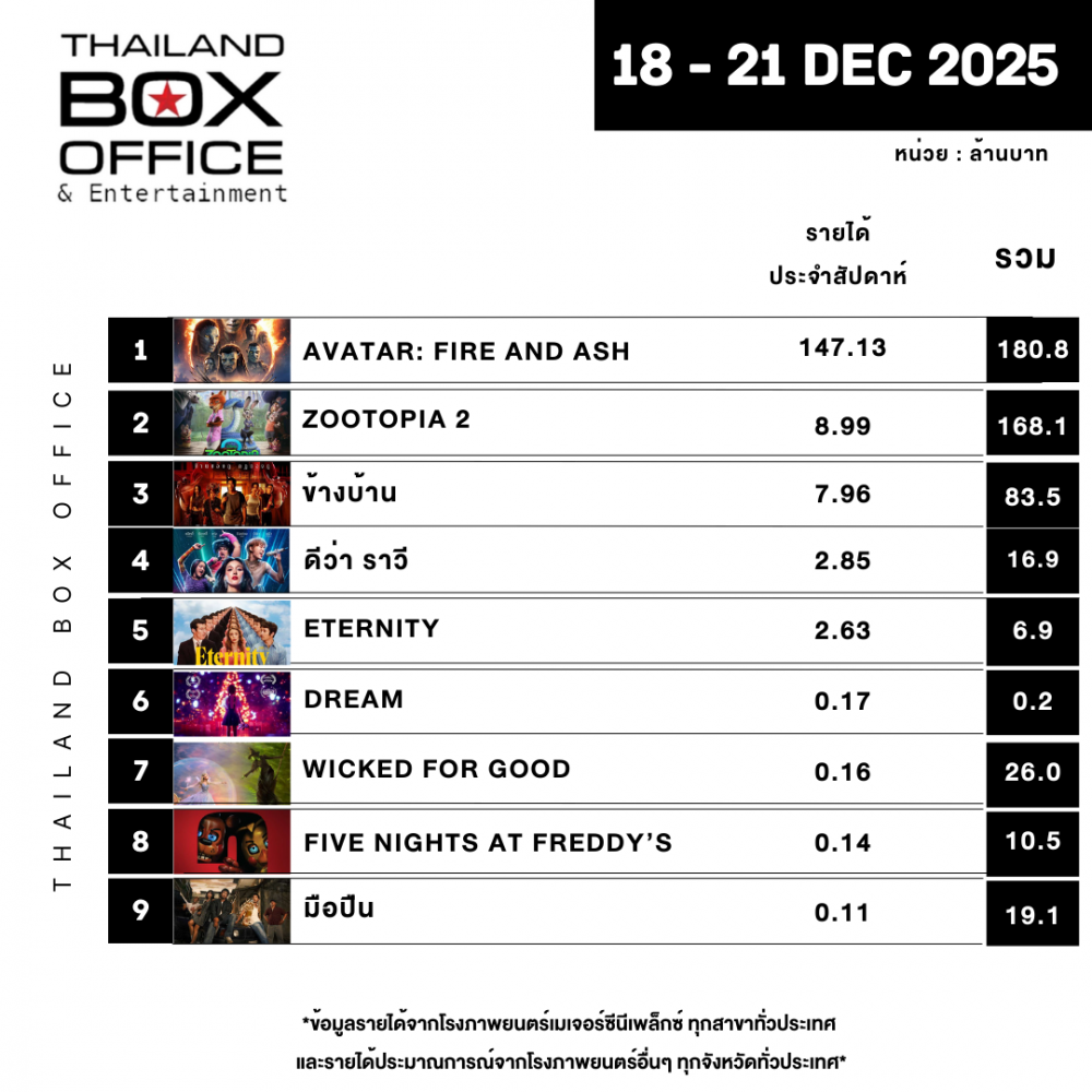 *ข้อมูลรายได้จากโรงภาพยนตร์เมเจอร์ซีนีเพล็กซ์ ทุกสาขาทั่วประเทศ และรายได้ประมาณการณ์จากโรงภาพยนตร์อื่นๆ ทุกจังหวัดทั่วประเทศ*