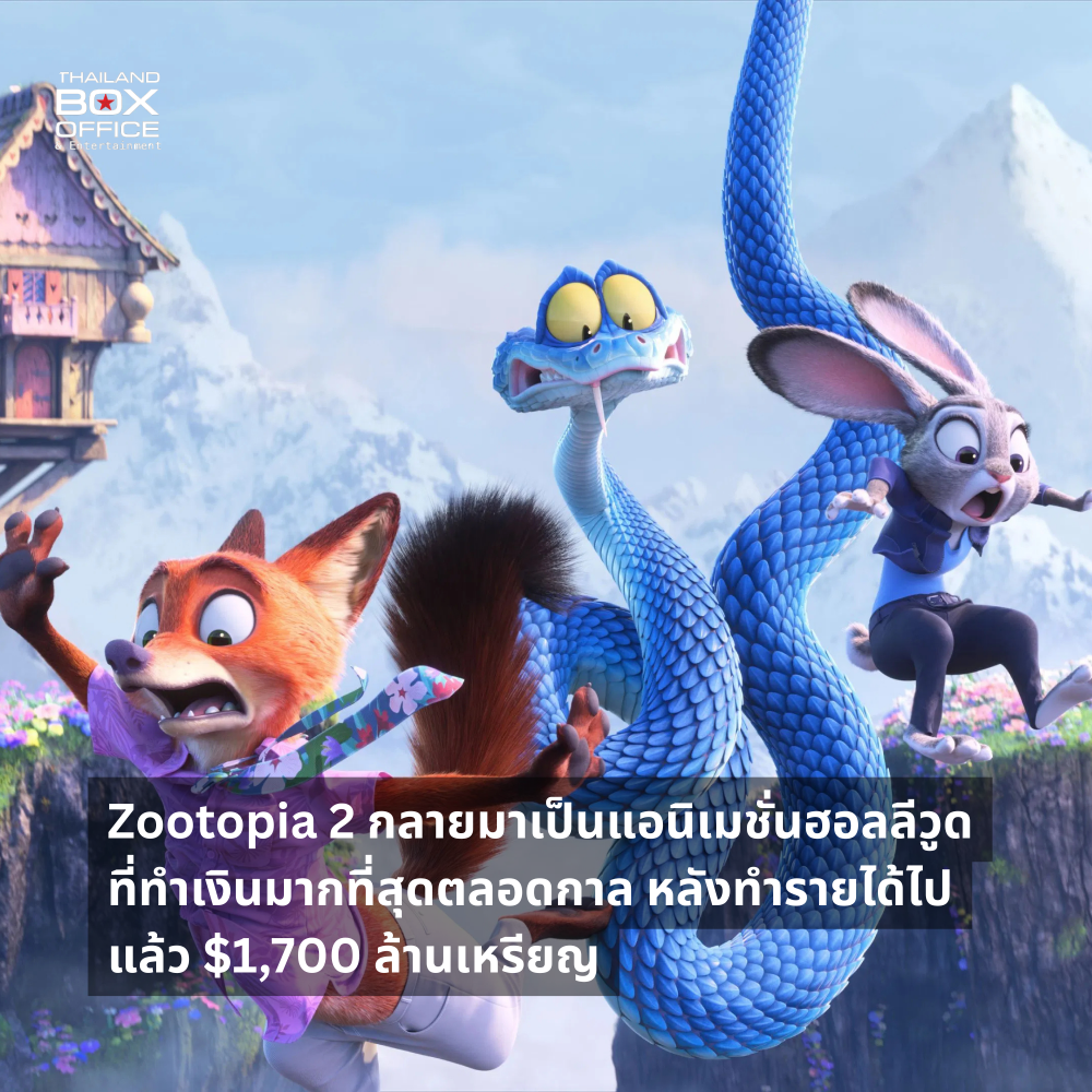 หลังจากเข้าฉายในโรงภาพยนตร์มาแล้วเกือบสองเดือน ในที่สุด Zootopia 2 (2025) หรือ นครสัตว์มหาสนุก 2 ก็ได้กลายมาเป็นแอนิเมชั่นจากฮอลลีวูดที่ทำรายได้สูงที่สุดตลอดกาลไปเป็นที่เรียบร้อยแล้ว ด้วยตัวเลขรายได้เกินกว่า $1,706 ล้านเหรียญ แซงหน้า Inside Out 2 (2025) หรือ มหัศจรรย์อารมณ์อลเวง 2 ที่ทำรายได้ไป $1,698 ล้านเหรียญ
