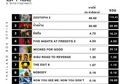 *ข้อมูลรายได้จากโรงภาพยนตร์เมเจอร์ซีนีเพล็กซ์ ทุกสาขาทั่วประเทศ และรายได้ประมาณการณ์จากโรงภาพยนตร์อื่นๆ ทุกจังหวัดทั่วประเทศ*