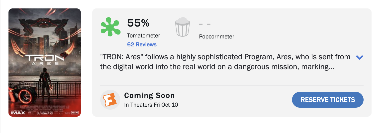 TRON: Ares หรือ ทรอน: แอรีส มีกำหนดการเข้าฉายในโรงภาพยนตร์ในวันที่ 9 ตุลาคม 2025