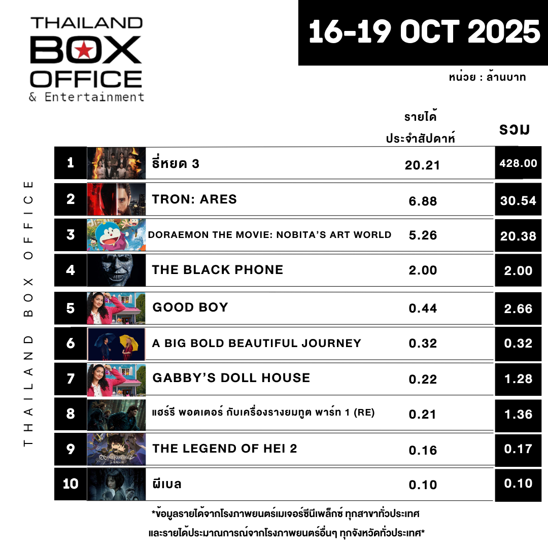 *ข้อมูลรายได้จากโรงภาพยนตร์เมเจอร์ซีนีเพล็กซ์ ทุกสาขาทั่วประเทศ และรายได้ประมาณการณ์จากโรงภาพยนตร์อื่นๆ ทุกจังหวัดทั่วประเทศ*