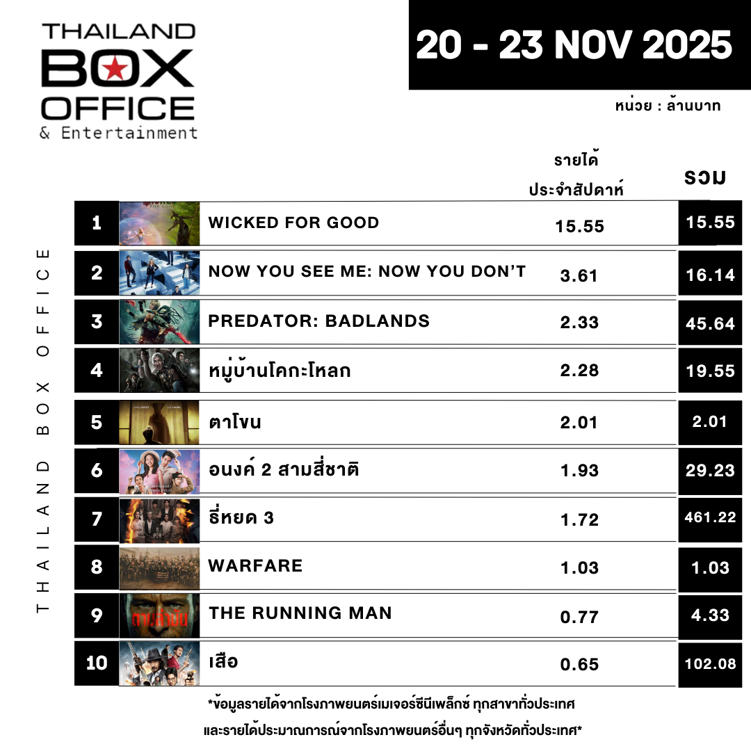 *ข้อมูลรายได้จากโรงภาพยนตร์เมเจอร์ซีนีเพล็กซ์ ทุกสาขาทั่วประเทศ และรายได้ประมาณการณ์จากโรงภาพยนตร์อื่นๆ ทุกจังหวัดทั่วประเทศ*