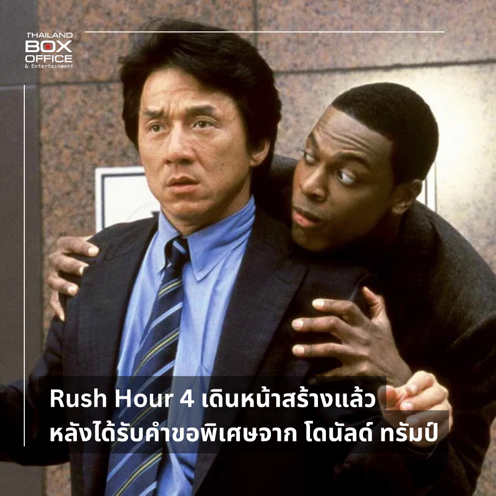 รายงานพิเศษจาก เซมาฟอร์ ได้เปิดเผยว่า โดนัลด์ ทรัมป์ ประธานาธิบดีสหรัฐอเมริกาคนปัจจุบัน ได้กดดันให้ทาง พาราเมาต์ รื้อฟื้นแฟรนไชส์ภาพยนตร์ตลกคู่หูตำรวจ Rush Hour ขึ้นมาใหม่อีกครั้ง และการกดดันดังกล่าวก็ได้ผลเป็นอย่างดี เพราะว่ามันได้ทำให้การสร้างภาพยนตร์ที่หลายคนรอคอยอย่าง Rush Hour 4 ได้เริ่มต้นขึ้นแล้วในตอนนี้