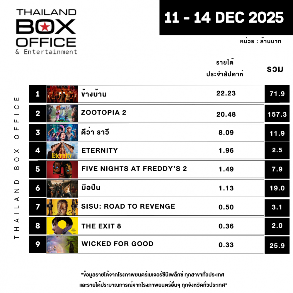 *ข้อมูลรายได้จากโรงภาพยนตร์เมเจอร์ซีนีเพล็กซ์ ทุกสาขาทั่วประเทศ และรายได้ประมาณการณ์จากโรงภาพยนตร์อื่นๆ ทุกจังหวัดทั่วประเทศ*