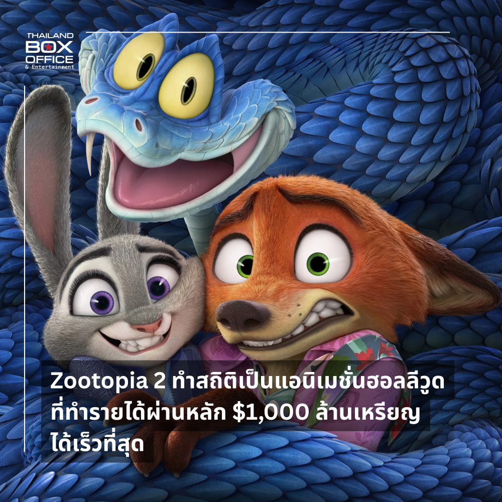 ในช่วงสุดสัปดาห์ที่ผ่านมา Zootopia 2 (2025) หรือ นครสัตว์มหาสนุก 2 สามารถทำรายได้จากการเข้าฉายในโรงภาพยนตร์ทั่วโลกไปได้แล้วถึง $1,136 ล้านเหรียญ ทำให้มันกลายมาเป็นแอนิเมชั่นฮอลลีวูดที่ทำรายได้ผ่านหลัก $1,000 ล้านเหรียญ ได้เร็วที่สุดตลอดกาล ด้วยเวลาเพียงแค่ 17 วันเท่านั้น
