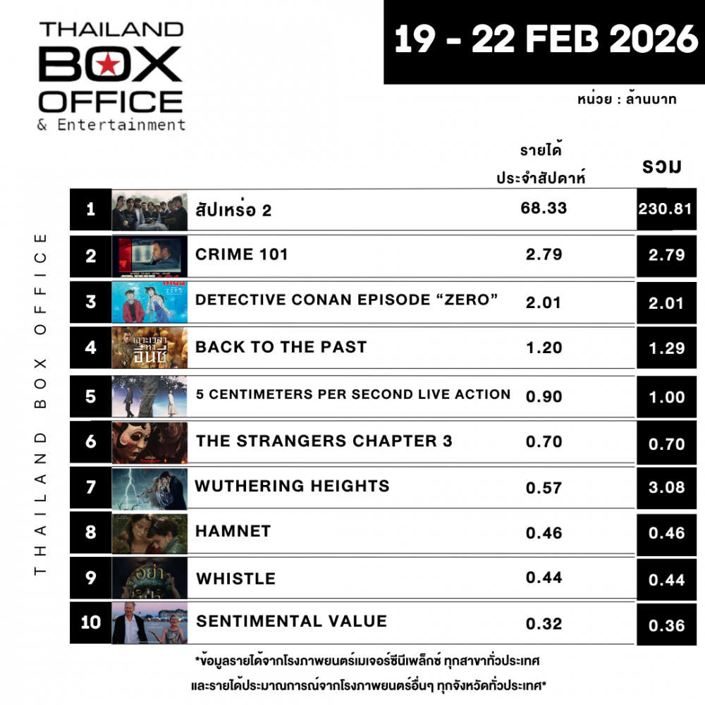 *ข้อมูลรายได้จากโรงภาพยนตร์เมเจอร์ซีนีเพล็กซ์ ทุกสาขาทั่วประเทศ และรายได้ประมาณการณ์จากโรงภาพยนตร์อื่นๆ ทุกจังหวัดทั่วประเทศ*